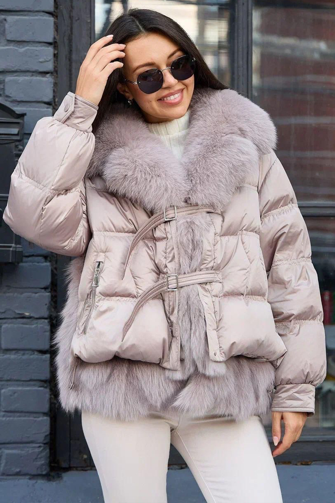 Стильный пуховик на зиму с ярким дизайном и капюшоном