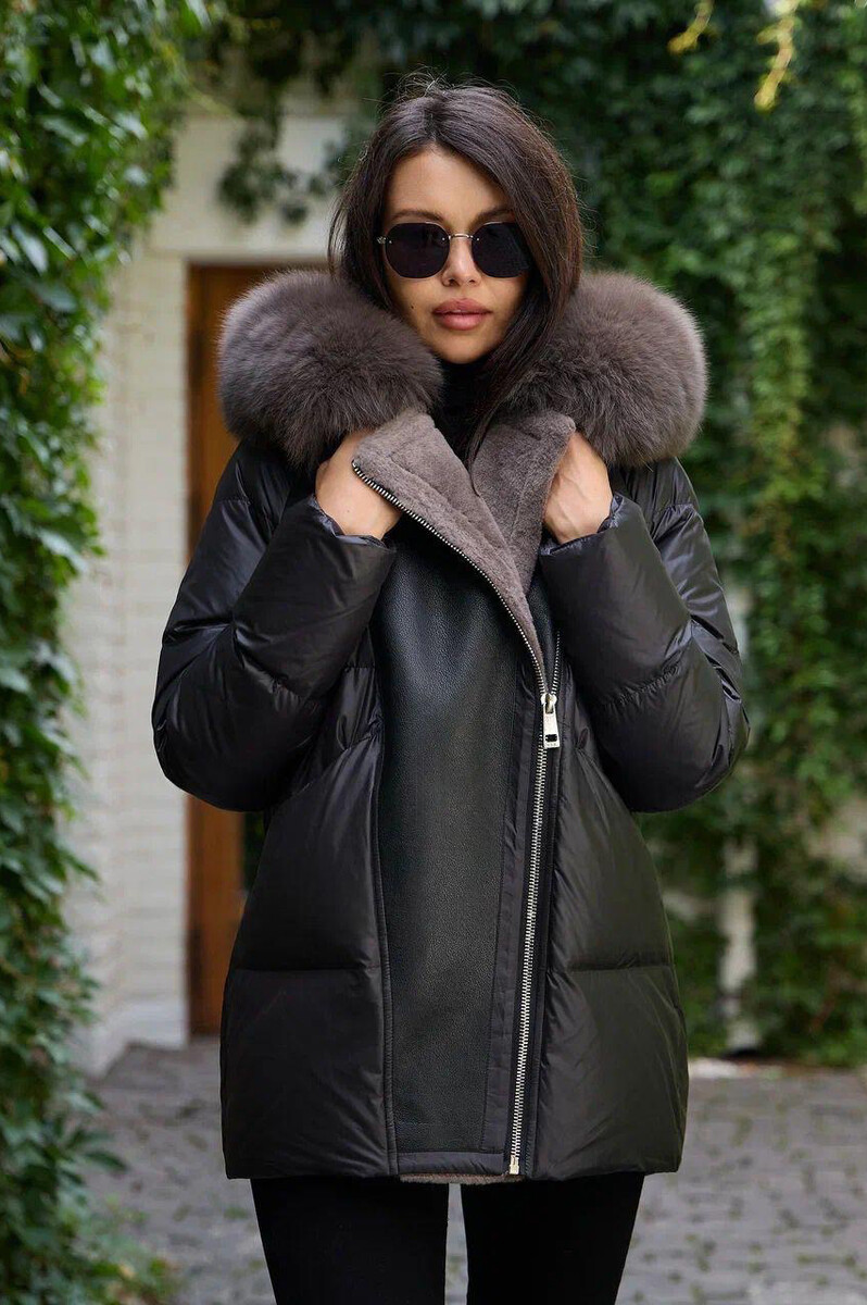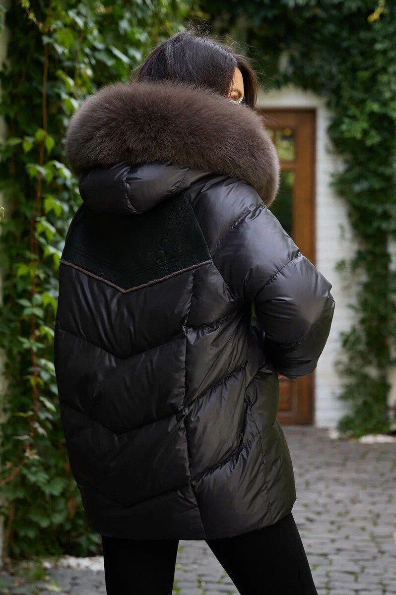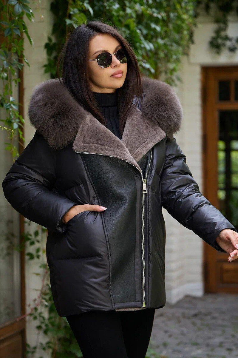 Пуховик с мехом и кожаными вставками