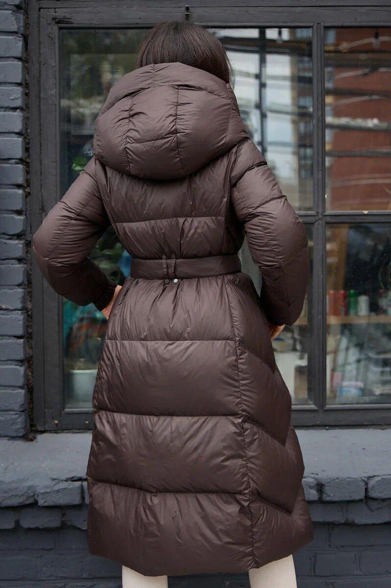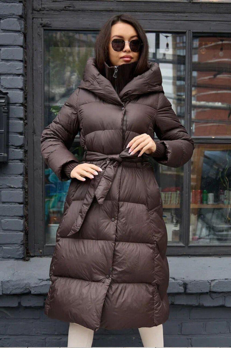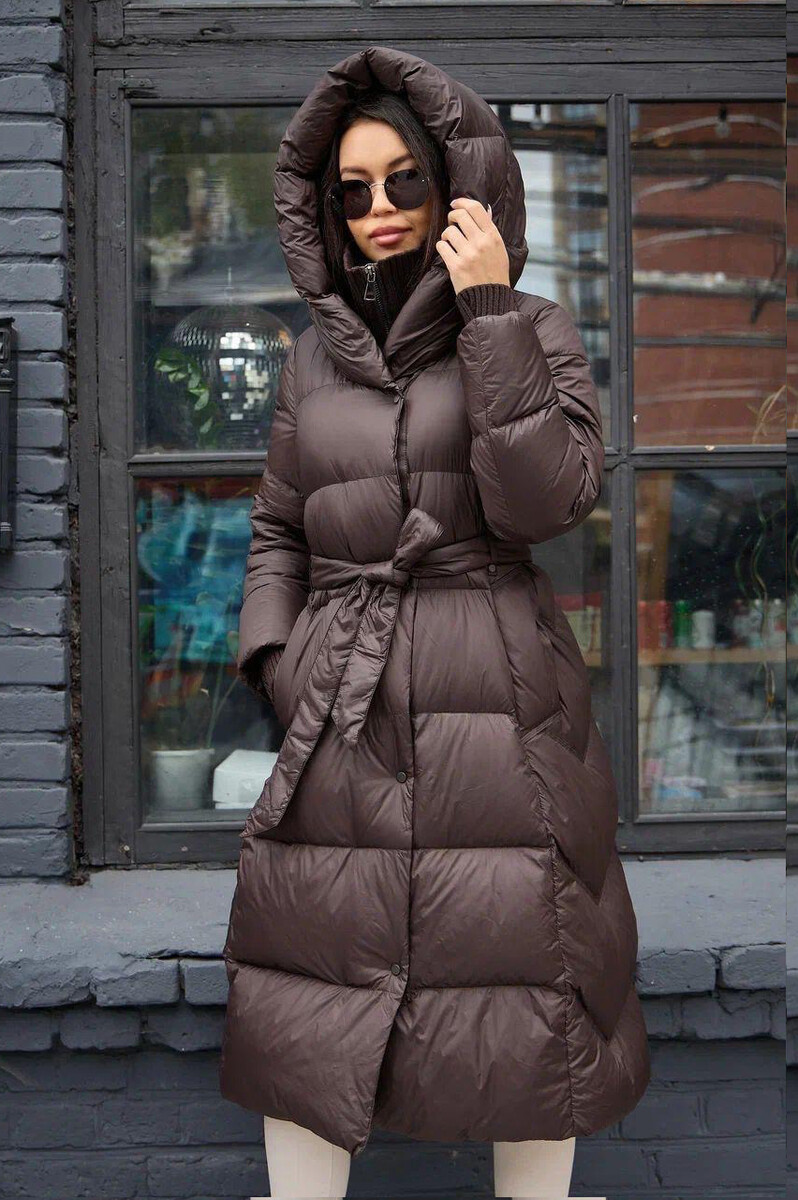 Длинный пуховик одеяло коричневого цвета со съемным капюшоном. Приталенное лекало с застежкой магниты и кнопки. Капюшон украшен узором. Два кармана по бокам. В нашем ассортименте есть разные цвета этой модели.