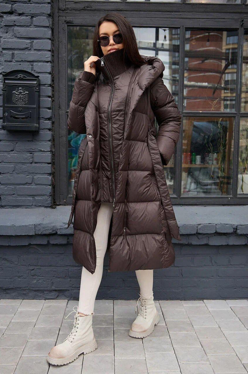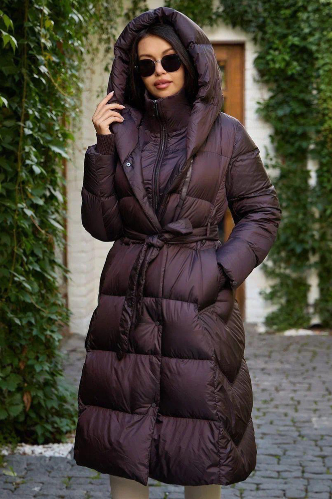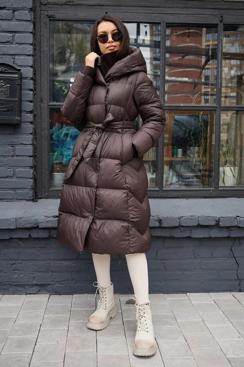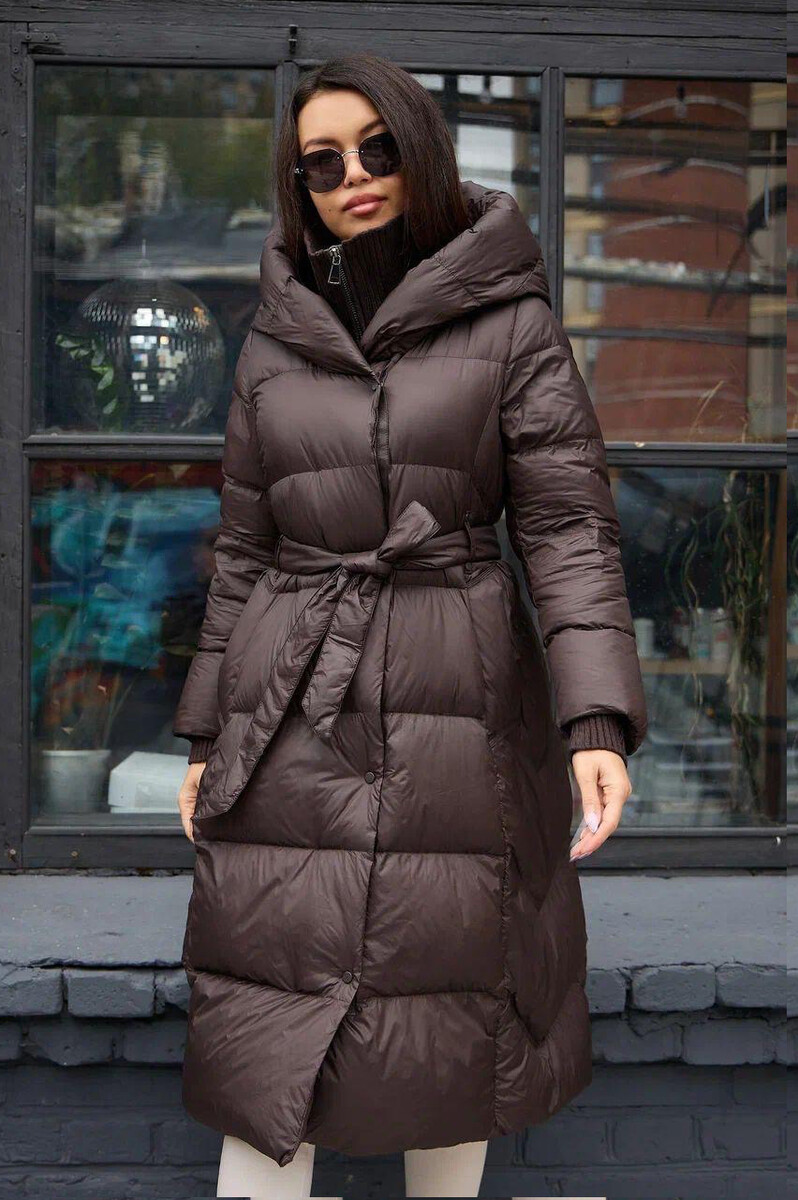 Длинный пуховик одеяло коричневого цвета со съемным капюшоном. Приталенное лекало с застежкой магниты и кнопки. Капюшон украшен узором. Два кармана по бокам. В нашем ассортименте есть разные цвета этой модели.