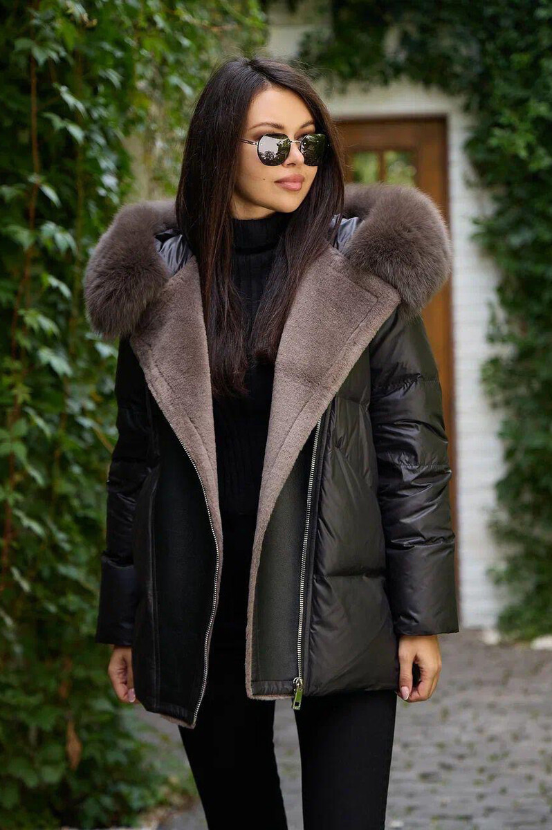 Пуховик с мехом и кожаными вставками