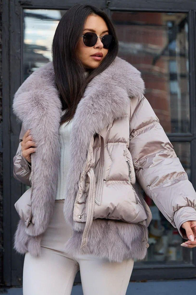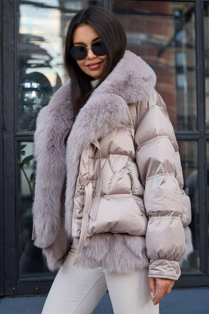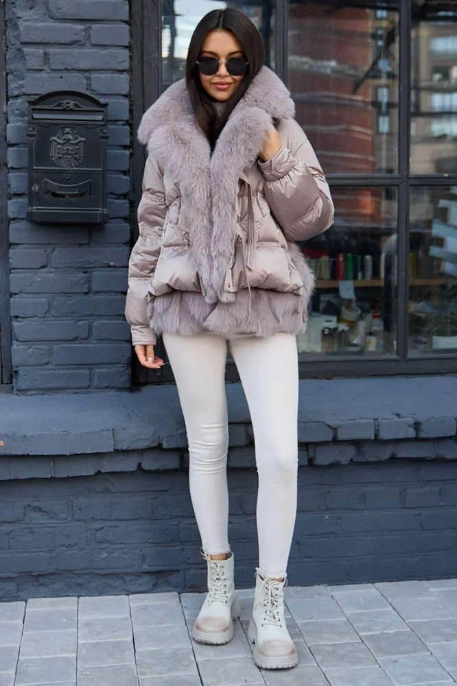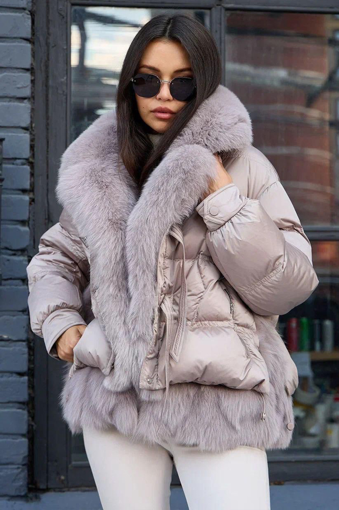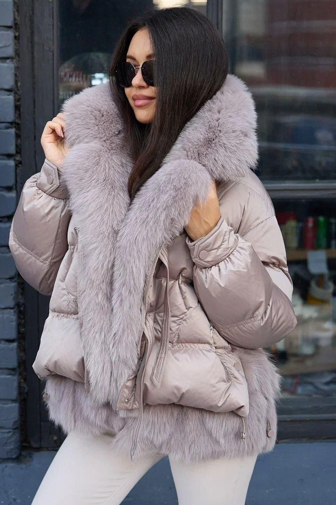 Стильный пуховик на зиму с ярким дизайном и капюшоном