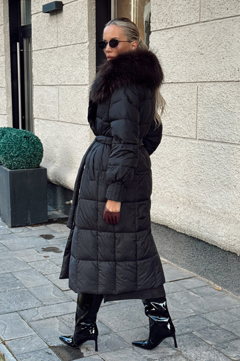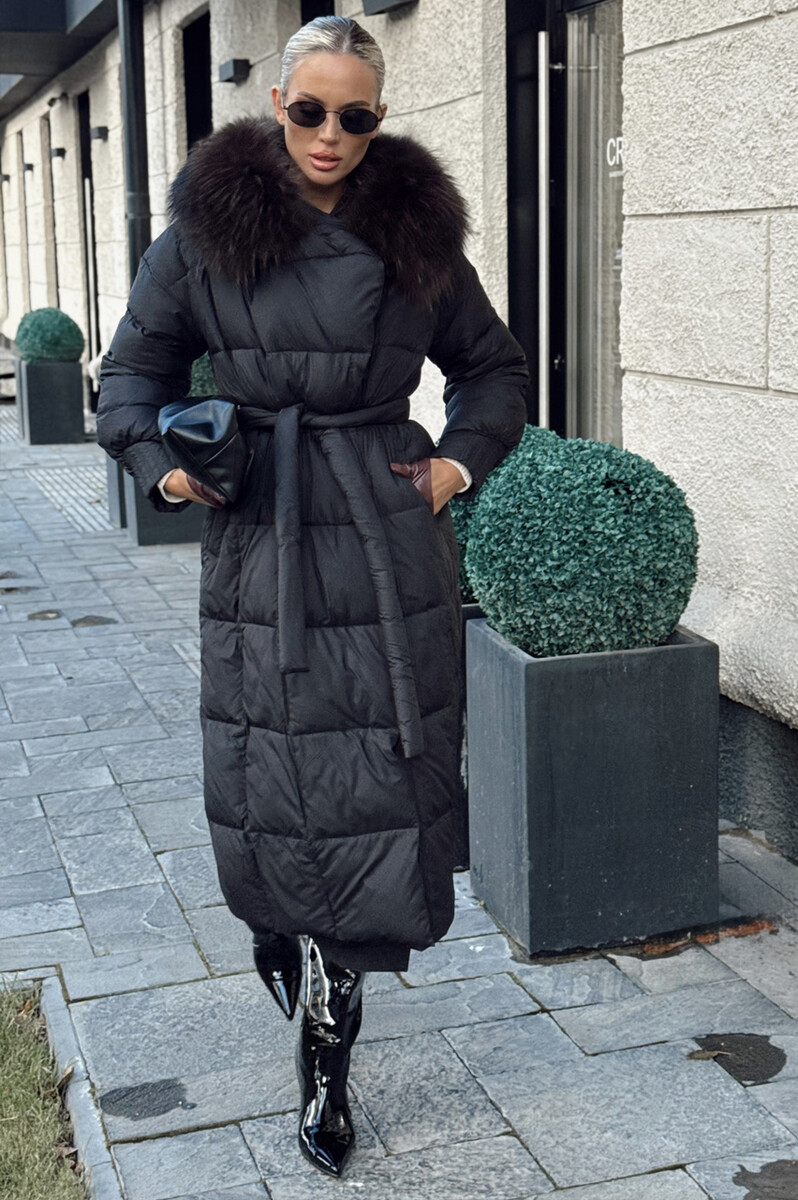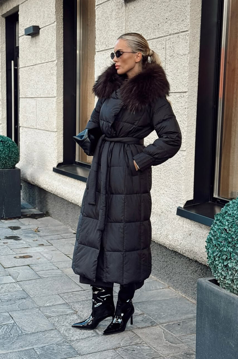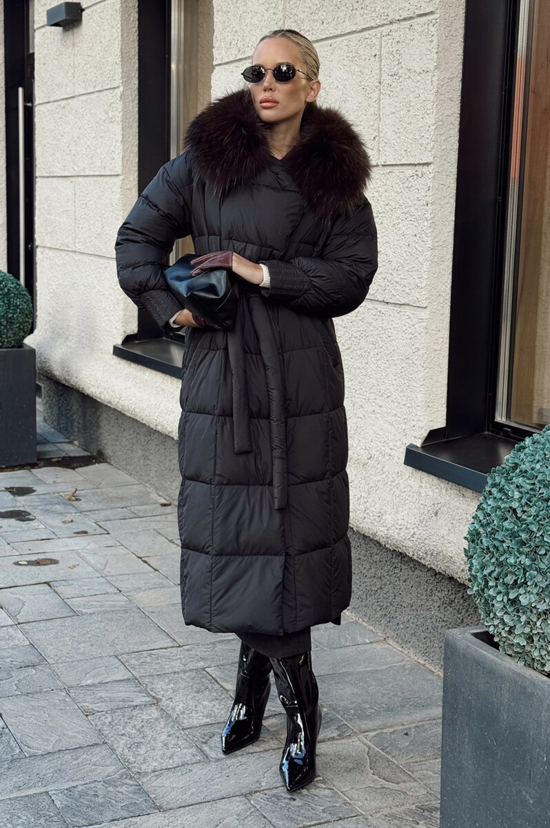 Длинный пуховик приталенный от фирмы Вивилона с мехом енота. Модель приталенная с пуховым наполнителе. Воротник, эксклюзивная стежка и оригинальный дизайн.