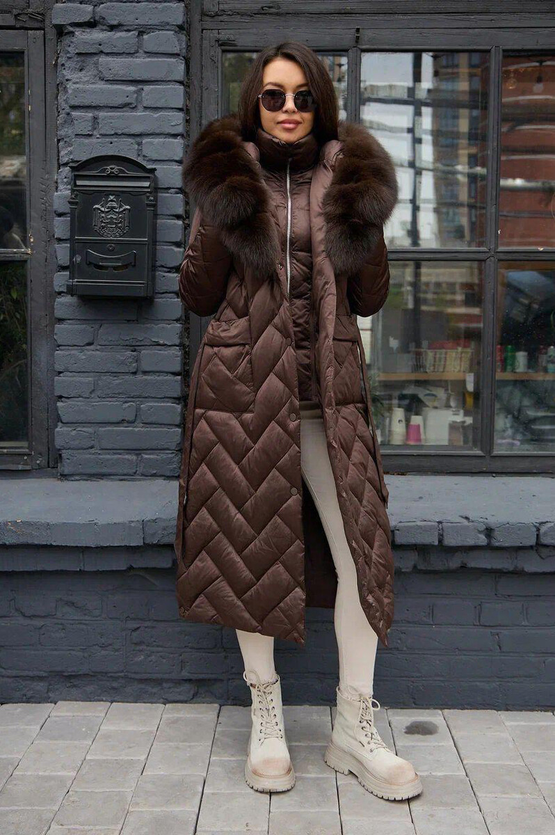 Модный пуховик Vivilona в черном цвете. Куртка из модельного ряда 2025 года выглядит очаровательно. Ровная прострочка, фабричная фурнитура, по бокам изделие украшено накладными карманами, на воротнике – меховая опушка из песца. Купить зимнюю длинную куртку можно в нашем магазине.