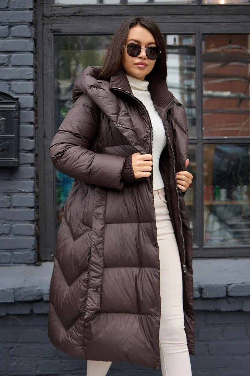 Длинный пуховик одеяло коричневого цвета со съемным капюшоном. Приталенное лекало с застежкой магниты и кнопки. Капюшон украшен узором. Два кармана по бокам. В нашем ассортименте есть разные цвета этой модели.